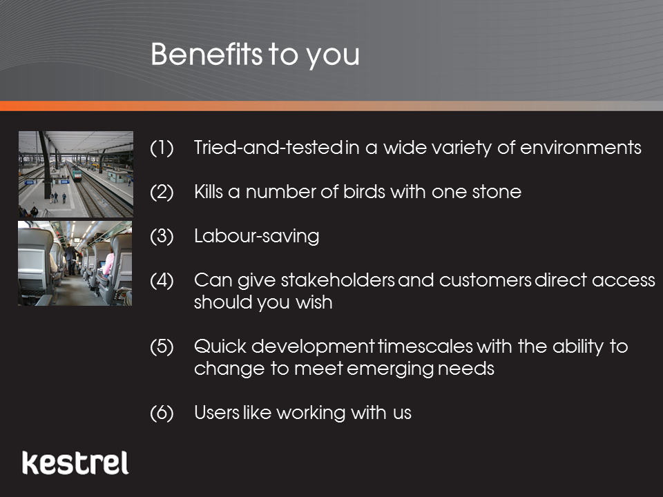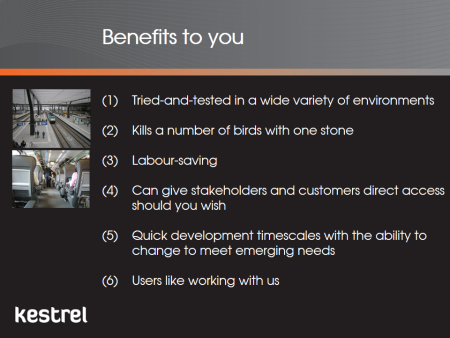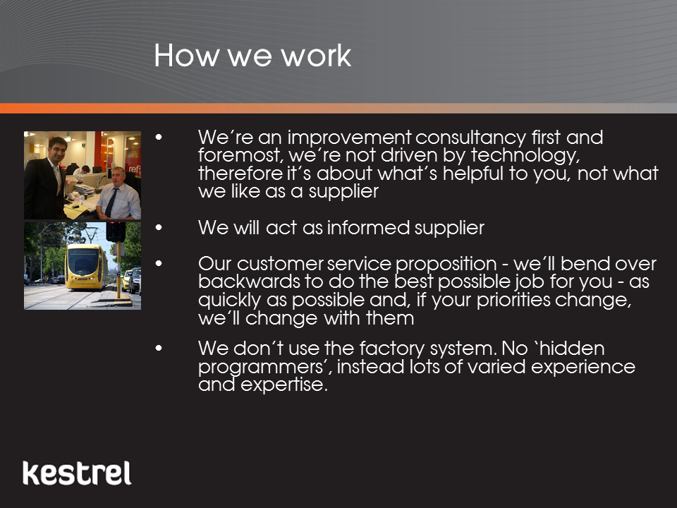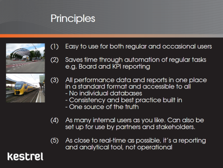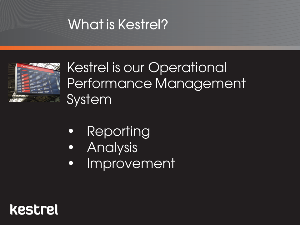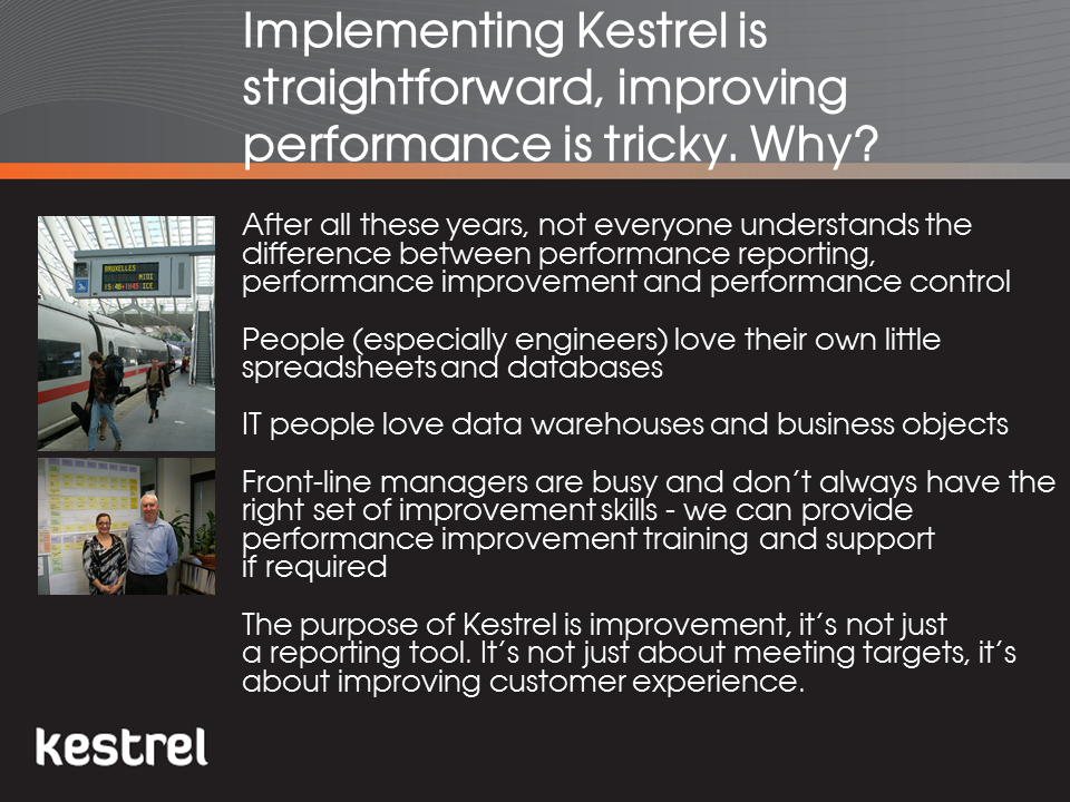 As an Organisational Improvement consultancy with a particular expertise in public transport and not just a software provider, we are able to provide training, facilitation and consultancy in both the use of the Kestrel and, more importantly, the managerial skills required to improve performance. This includes how develop performance strategies and how to set up and run performance improvement processes and projects. This is enhanced by our wide experience of other industries meaning we are not constrained in our thinking by any one set of norms and practices.