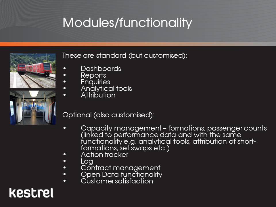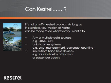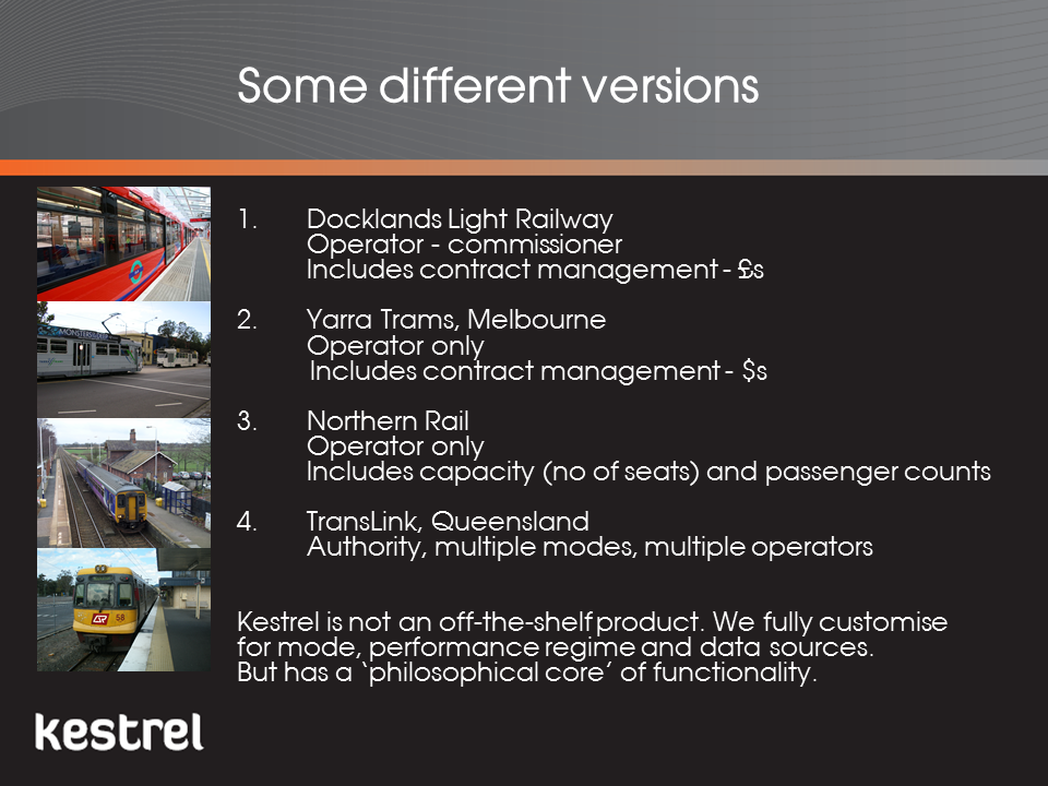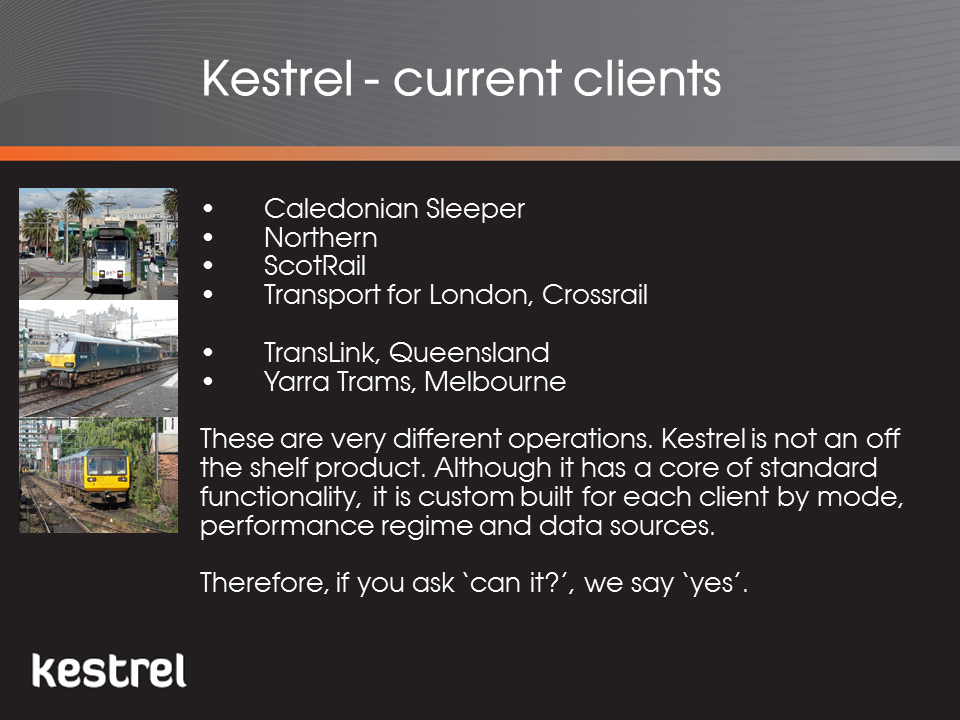 Kestrel is in use in both Australia and the UK and has been specifically designed so it can be rapidly customised for any mode (rail, light rail, tram, bus and ferry or multi-modal networks), performance regime or data source. Clients include Yarra Trams in Melbourne, one of the largest tram networks in the world, Caledonian Sleeper, operating just seven trains a day and Transport for London, responsible for monitoring trains on the UK's newest piece on infrastructure, the Elizabethan Line.